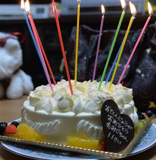 | 夜、改めてお祝い〜♪ ローズデコのケーキ〜葵がフーしてくれました。 |